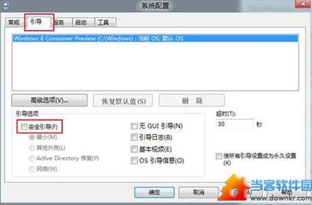 2.、在进入系统后,按Win+R运行输入msconfig确定选择——引导——把安全引导勾选中确定重启后就可以进入Win8安全模式。