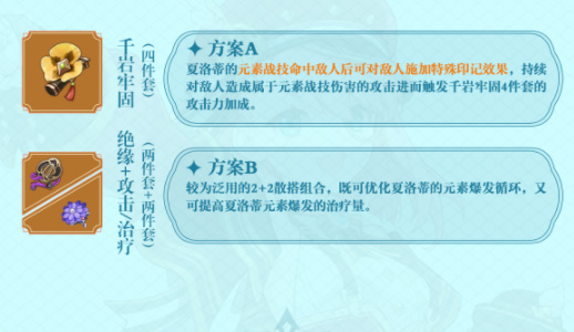 原神夏洛蒂是枫丹蒸汽鸟报社的一位记者,是一位四星冰元素法器角色,在战斗中可以发挥出治疗属性。很多玩家在抽到夏洛蒂后不知道怎么培养。小编下面就为大家带来原神夏洛蒂的培养攻略大全,还不知道怎么培养的小伙伴可以来看看。 《原神》夏洛蒂培养攻略 一、角色分析 夏洛蒂是一名利用技能为全队回复生命的冰元素治疗型角色。施放元素爆发后可为全队回复生命,利用元素爆发对敌人施加冰元素附着,依靠重击即可施放芒性的灵息之刺伤害。其冰元素法器的特性使得真爱党玩家也可考虑冰伤输出玩法。 二、技能介绍 1、普通攻击:冷色摄影律 普通攻击以特制留影机「温亨廷先生」瞄准目标,进行至多三段的攻击,造成冰元素伤害; 重击消耗一定体力,短暂准备后,部署「温亨廷先生」,造成冰元素范围伤害。 2、战技:取景·冰点构图法 凝聚王牌记者的锐意,尽情施展摄影技巧,依据点按、长按,以不同的方式产生效果。 3、元素爆发:定格·全方位确证 以冰霜凝聚《蒸汽鸟报》的招牌,建立「临事场域」造成冰元素范围伤害,为队伍中附近的所有角色恢复生命值,回复量受益于夏洛蒂的攻击力。 三、武器推荐 天空之卷:副属性提高攻击力,具有高额基础攻击力数值,提高夏洛蒂的治疗量,此时圣遗物需要多堆叠元素充能效率。 西风秘典:夏洛蒂的攻击造成暴击后可以额外产出能量微粒、副属性提高元素充能效率,优化技能循环。 试做金珀:该武器对于以攻击力作为治疗量结算的夏洛蒂而言主要利用的是武器技能的能量回复,满精炼时在释放元素爆发后可以回复18点能量,降低充能需求,但整体没有特别哭合。 四、圣遗物推荐 1、四千岩 夏洛蒂的元素战技命中敌人后可对敌人施加特殊印记效果,持续对敌人造成属于元素战技伤害的攻击进而触发千岩牢固4件套的攻击力加成。 2、二绝缘+二海染 较为泛用的2+2散搭组合,既可优化夏洛蒂的元素燥发循环,又可提高夏洛蒂元綦爆发的治疗量。 五、阵容推荐 1、夏那芙枫队:夏洛蒂+那维莱特+芙宁娜+万叶 双水元素共鸣,提高全队生命值上限。芙宁娜利用元素战技造成后台伤害,元素爆发会记录全队的生命变动来提高全队造成的伤害。万叶利用扩散水元素提高全队水伤、配合风套4件降低敌人水元素抗性。夏洛蒂利用元素战技持续触发冰元素伤害,同时利用元素爆发持续治疗我方全体角色,保障芙宁娜元素爆发的增伤层数。那维莱特作为前台角色进行持续输出。 2、夏莱芙枫:夏洛蒂+莱欧斯利+芙宁娜+万叶 双冰共鸣,提高对应情况下技能的暴击率。芙宁娜利用元素战技造成后台伤害,元素爆发后会记录全队的生命变动情况提高全队造成的伤害。万叶利用技能触发冰、水元素扩散。提高全队冰、水伤加成、配合风套4件降低抗性。夏洛蒂利用元素战技持续触发冰元素伤害,同时利用元素爆发持续治疗我方全体角色,保障芙宁娜元素爆发的增伤层数。莱欧斯利作为前台角色持续对敌人造成伤害。 |