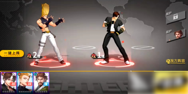 2、阵容搭配:根据敌人的阵容来看,大家需要开场可以提供怒气值的角色。*关相对来说难度较低,系统已经给大家配置好了草薙京和二阶堂红丸进行战斗。