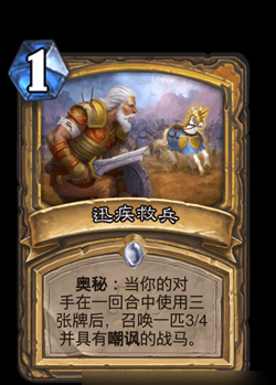 迅疾救兵(Galloping Savior)是圣骑士职业中的一张普通品质卡牌。使用这张法术牌只需消耗1点法力值。当对手在一回合内使用了3张牌后,便可召唤出一匹3/4的嘲讽效果战马。