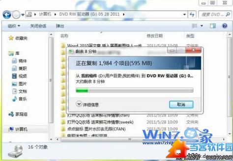 2、在完成对空白光盘格式化后,自动打开空白光盘,将需要刻录到光盘的文件复制、剪切或拖动到空白光盘窗口中,刻录机开始工作,将相关文件刻录到光盘中;