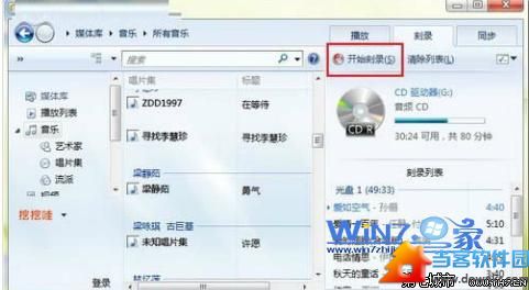 4、如果选择“生成一张数据CD”,单击“下一步”,系统会调用Windows Media Player,此时我们只需要单击“开始刻录”按钮,Windows7将自动完成刻录工作。