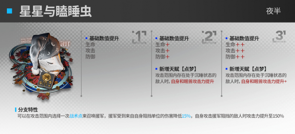 明日方舟战术家模组强度介绍 先说一下分支的特点。你可以在攻击范围内选择一个战术点来召唤援军。增援部队受到被增援部队阻挡的单位造成的伤害减少15%。攻击被援军阻挡的敌人时,攻击力提升至150%。 缪尔赛斯 白色值:生命、攻击、防御 升级效果:3级时,可以召唤流形,复制待部署干员的所有属性,并附加额外效果。之一次部署后您将立即获得几个技能点。 这个模块的效果非常好。感觉就像不假思索地打开了3级。虽然初期的移动问题还没有解决,但至少是100%复制了,加上落地点火,15%减伤的好处也很不错了。至少确实不需要担心。如果你掉落克隆体,你就会被杀死。 伺夜 白色值:生命、攻击、防御 升级效果:狼影数量由两个变为三个,并且增加了一个附加效果。每损失一个狼影,狼群就会获得一定比例的+物理闪避,持续数秒。 这也不错,至少你有一个 *** ,至少还有希望完成三技能,这也不错。 夜半 白色值:生命、攻击、防御 升级效果:附加效果,自身和沉睡兽的攻击力增加。 豆苗 白色数值:生命、攻击 升级效果:附加效果,螃蟹格挡敌人时防御力增加。 在无数次的挑战与冒险之后,那座神秘的巴别塔终于被攀登而至。勇者们站在塔顶,俯瞰着远方,心中充满了对未来的期待与希望。而这一切的背后,正是战术家模块的智慧与力量所赐予的。在《明日方舟》的世界里,每一个玩家都有机会成为一名真正的战术大师,引领自己的队伍征战四方,书写属于自己的传奇故事。愿你我一同踏上这段奇妙的旅程,探寻无尽的可能与惊喜! |