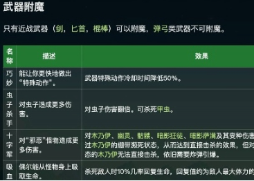 星露谷物语中玩家对我们的武器和工具进行附魔,附魔之后会进一步提升它们的使用效果,具有有哪些附魔效果呢,又应该怎么进行选择,下面就为大家带来星露谷物语附魔属性大全,分别从武器和工具方面来进行参考。 星露谷物语附魔属性大全 一、武器附魔属性 1、巧妙:武器特殊动作的冷却时间降低50%。 2、虫子杀手:对虫子的伤害翻倍,还可以杀死装甲虫。 3、十字军:对不死族、暗影族伤害增加50%,可直接杀死木乃伊。 4、吸血鬼:进行攻击时,有几率恢复一部分血量。 5、干草:玩家在破坏杂草时,有50%概率获得纤维,33%概率获得干草。 二、工具附魔属性 1、自动挂钩:鱼咬钩时自动钩住鱼。 2、高效:不消耗钓竿的耐力 3、保存:有50%概率不消耗饵和钓具耐力。 4、考古学家:在蚯蚓地板中发现物品的概率加倍。 5、慷慨:使用锄头挖出物品后有50%概率翻倍。 6、迅速:提升锄头的挖掘速度。 7、深不见底:喷壶的水是无限的。 8、强力:提高斧头和镐的额外的力量等级。 以上就是星露谷物语附魔属性大全,武器附魔有巧妙、虫子杀手、十字军、吸血鬼和干草,工具附魔属性包括了自动挂钩、高效、保存、考古学家、慷慨、迅速、深不见底和强力,针对道具和属性的不同合理地选择。 |