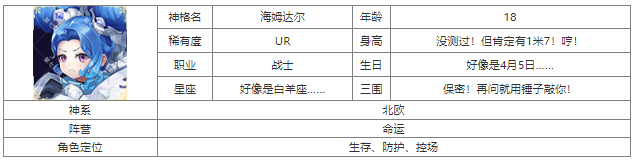 《第七幻域》手游已正式上线!在游戏中,角色的稀有度分为UR、SSR、SR、R、N五个级别。想了解UR级别的海姆达尔的技能表现吗?不妨一起来看看小编为大家准备的《第七幻域》海姆达尔神格图鉴! 《第七幻域》海姆达尔神格图鉴: 神格信息 立绘 技能介绍: 技能名称:主动技能1 技能描述:无畏之心 详细属性 给我方攻击力最高的三名神格套上相当于海姆达尔最大生命值60%的不可驱散护盾,持续三回合,同时使目标进入【无畏】状态,受到的伤害降低20%,造成的伤害增加20%,持续1回合 技能名称:主动技能2 技能描述:天怒爆发 详细属性 对前排3名敌人造成310%的物理伤害,自身进入【天怒】和【挑衅】状态,受到伤害降低60%,并获得60%的反伤,并强制敌方普通攻击和单体技能伤害攻击自己,持续2回合 技能名称:被动技能1 技能描述:警戒之眼 详细属性 血量上限+15%,防御力+15% 技能名称:被动技能2 技能描述:彩虹守护者 详细属性 攻击力+20%,暴击值+15% 技能名称:被动技能3 技能描述:叹息之墙 详细属性 物抗+25%,魔抗+25% 技能名称:被动技能4 技能描述:决胜号角 详细属性 血量上限+25%,伤害反弹+20% 技能名称:从神技能 技能描述:神威号角 详细属性 使主神的生命值、防御力和韧性提升18%,进入战斗时,使我方全体受到的伤害降低23%(不可驱散),持续2回合 专属神器 神器名称 加拉尔号角 神器效果 伤害反弹+15% 增加生命18% |