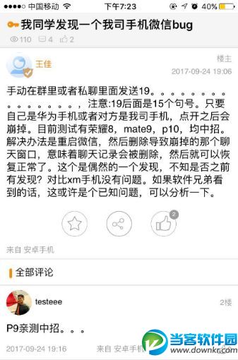 目前出现这个问题的手机有:荣耀8、华为Mate 9、华为P10、华为P9、魅族MX6、OPPO A73这6款机型,而相应的微信版本为6.5.15.13(全新版本为6.5.17)。所以据猜测,可能是微信版本方面出现的BUG,但也有很大几率与手机本身的适配相关,因为小米手机在测试中并没有出现崩溃的情况。 对于这个问题相关用户表示,暂时没有有效的解决办法,只能重启手机并删除相应的聊天窗口,但这意味着聊天记录也会被删除。 以上就是关于“哪些手机会出现15加15个句号卡死? ”的内容介绍,更多精彩资讯,请关注当客下载站! |