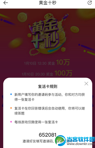 复活卡规则 新用户填写你的邀请码参与活动,你和对方均获 得一张复活卡 复活卡在你回答错误后会自动使用,你将可以继 续答题 每场游戏仅限使用一张复活 答题内容介绍 每期会有12道选择题,题目范围将涵盖科学、文化、综艺、艺术等各个领域 你有10秒作答时间,超时或答错都会被淘汰;答对12道题目,即成为赢家 如果超过1人冲顶成功,奖金会被平分;否则,你将独占当期所有奖金 奖金的额度会在“特别的日子”或游戏玩家增加的情况下不断提升 |
