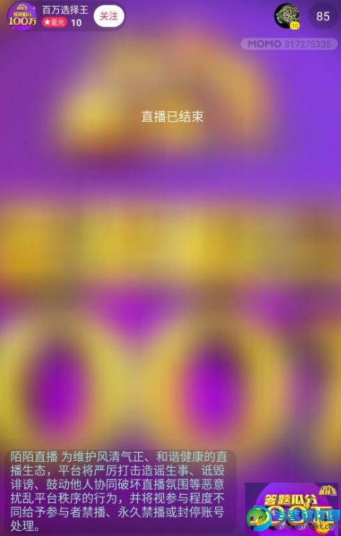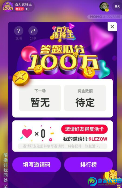最近一段时间,都是各种各样的好玩的答题活动,答题的同时看,不仅能够学到很多的知识,最重要的还是可以拿到对应的红包哟!这不,陌陌平台推出的现金答题活动,那就是陌陌百万选择王答题活动,不知道你玩过了没有呢?下面小编就给大家简单介绍一下这个答题软件的入口吧! 百万选择王答题进入方法介绍: 1.首先下载最先版的陌陌百万选择王版本(立即下载),有账号的登陆,没有账号的注册完成后登陆! 2.我们打开陌陌APP,进入到主页,然后点击下方的“直播”选项栏,进入直播列表! 3.点击“直播”列表上的搜索框。我们输入“百万选择王”,我会出现一个官方的直播间,注意不要进错了哟! 4.我们点击进入后,这里就是官方直播间的详情,我们点击关注,然后点击上方的进入直播间,就可参与答题! 5.这里我们可以看到自己的要有邀请码,填写好友的邀请码可以领取复活卡一张,我们填写“9LEZQW”领取一张复活卡! 6.最后就等官方宣布答题时间我们去答题就可以啦祝大家顺利领取奖金! 以上就是陌陌百万选择王答题入口的介绍,了解更多资讯,请关注当客下载站! |