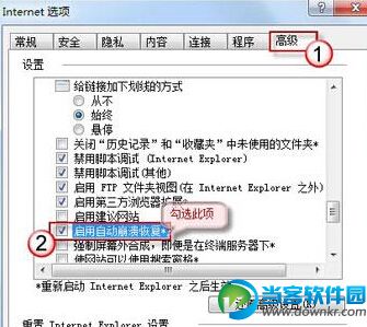 在弹出来的窗口中,我们先将选项切换到高级,然后在下面的设置选项中下滑找到“启用自动崩溃恢复”这一项,将前面方框中的钩勾选上即可!