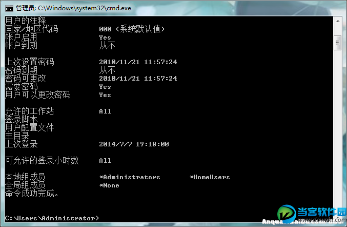 没错,它就是超级管理员用户!不过它一般默认是关闭的,这是微软为了用户安全而设置的一个保护措施(打开的方式:在cmd文框中输入net user administrator /active:yes 注意空格,将yes改为no则关闭,但需要一定权限),这里为了避免麻烦我还是直接使用了这个用户,一般同学请不要随意开启哦~