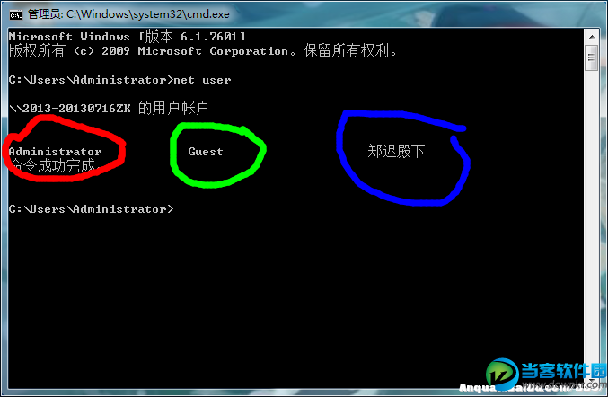 通过cmd下的net user指令我们能够清楚的看到,在一般的系统中,存在的权限有一下几个