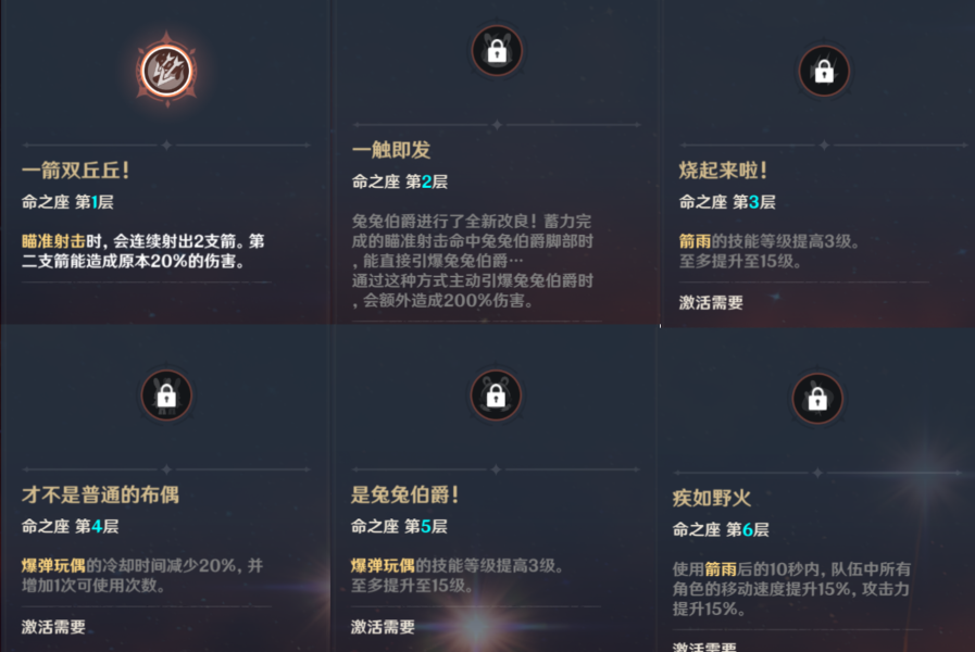 原神安柏命之座是什么效果?玩家们都知道吗?要是不知道的话就快来这里看看吧,小编这就为玩家们介绍一下,帮助玩家们了解更多! 原神安柏命之座分析介绍命之座一:一箭双丘丘!和温迪一比差距就出来了,不仅比人家少一支箭伤害还少了13%,好在是连续两箭射不中的概率大大下降。这也是蓄力痛苦流比较重要的命之座效果,第二支箭可以吃到“压制射击”的效果,而且也可以参与元素反应。 命之座二:一触即发命中兔兔伯爵脚部可直接引爆兔兔伯爵造成两倍伤害,是兔兔核爆流的理论基础。但是触发条件比较苛刻,兔兔伯爵的脚部可不好瞄准,而且有时候还会被草丛挡住。 命之座三:烧起来啦!常规命之座,增加箭雨等级(3级)及等级上限。 命之座四:才不是普通的布偶 减少爆弹玩偶的冷却时间及增加1次使用次数,是兔兔核爆流的重要命之座效果,两倍爆炸伤害+两个兔兔伯爵可以把瞬时输出拉满。 命之座五:是兔兔伯爵!常规命之座,增加爆弹玩偶等级(3级)及等级上限。 命之座六:疾如野火安柏释放完大招可以为队伍增加15%的移速和15%的攻击力,是比较不错的Buff效果,也是辅助流安柏的核心命之座。 |