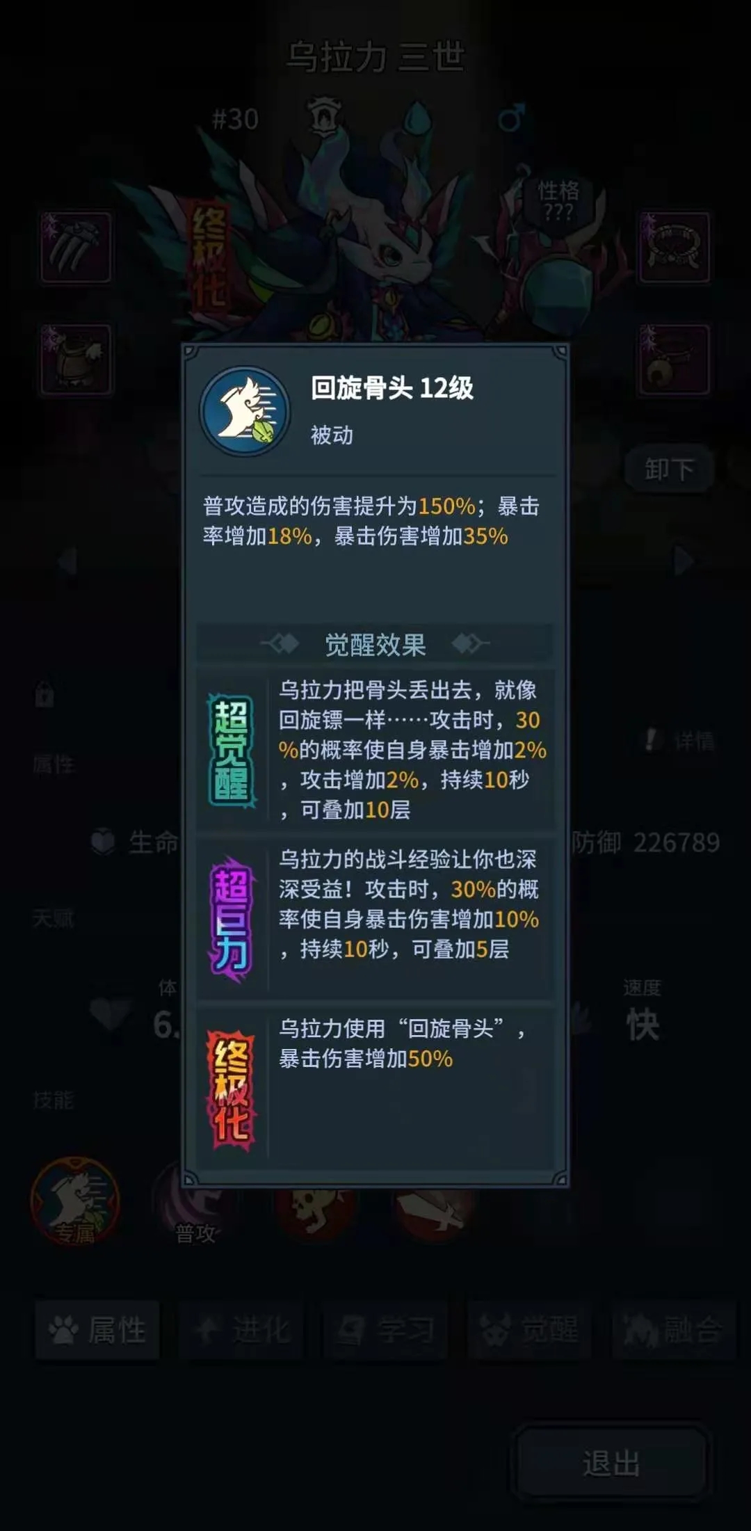 编号30乌拉力,格斗系宠物,力量资质极高,体力耐力较差,攻击速度快。 回旋骨头 12级 被动 效果:普攻造成的伤害提升为150%;暴击率增加18%,暴击伤害增加35% 觉醒效果 超觉醒:乌拉力把骨头丢出去,就像回旋镖一样……攻击时,30%的概率使自身暴击增加2%,攻击增加2%,持续10秒,可叠加10层 超巨力:乌拉力的战斗经验让你也深深受益!攻击时,30%的概率使自身暴击伤害增加10%,持续10秒,可叠加5层 终极化:乌拉力使用“回旋骨头”,暴击伤害增加50% 就技能上来说,乌拉力是目前最强的输出宠物,满觉醒叠满被动的情况下,自带38%的暴击,20%攻击,135%的额外爆伤加成,算上基础爆伤就是285%。 在加上普攻伤害提高到了150%,乌拉力的普攻伤害可达到427.5%的高额倍率; 目前技能伤害倍率最高的是迦雷龙,满级480%*135%=648%,无视90%防御,但是是主动技能,冷却时间10秒。 而我们的乌拉力是普攻,快速的攻击基础是1s,而且还能吃到攻速加成,配合狮子的识破效果,乌拉力也能进入无视防御状态。 所以,我愿称乌拉力为地表最强输出宠。 当然,这是个和妙喵娘、迦雷龙一样的氪金宠,非常贵就是了,神豪必备,平民别碰。 |