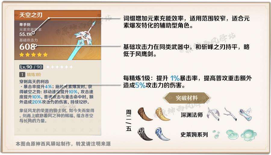 原神天空之刃给谁用好?原神今日更新了1.4版本,天空之刃这把单手剑也重新加入了武器池,很多玩家还不知道其强度如何,值不值得来抽,下面就为大家带来原神天空之刃强度解析及使用角色推荐。 原神天空之刃强度解析及使用角色推荐强度指数:★★★☆☆ 抽取价值:★★★☆☆ 装备评价: 武器强度最低的五星单手剑,是玩家痛苦武器系列之一。武器主副词缀模板与「终末嗟叹之诗」相同,但其不具备辅助能力。适用范围较低,一般不会被用作主C的输出武器,武器技能提高的暴击率聊胜于无,触发武器特效后附加的攻速/移速/百分比攻击力物理伤害对驻场物理主C的提升也比不过物理单手剑神器「风鹰剑」。在当前版本只适合攻击力型元素爆发特化辅助类角色,比如琴、班尼特等,精炼提升较低。 适合角色: 琴(解决了琴的充能问题) 班尼特(高白值的同时赋予解决充能问题) |
