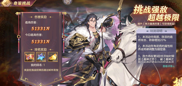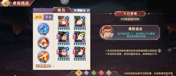 今日的乘胜追击挑战中,陈宫、高顺的最终攻击、最终防御增加20%,打起来难度不是很高。