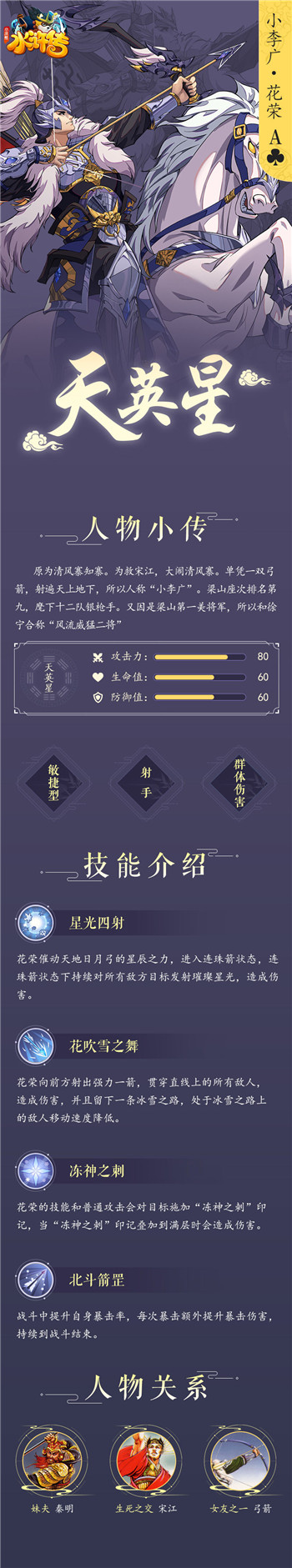 小浣熊水浒传花荣怎么样?厉害吗?“花荣”是小浣熊水浒传里面的角色之一,在梁山泊中的排名为“第九”,武力超群。下面带来小浣熊水浒传花荣强度评测,希望对各位小伙伴们有所帮助。 小浣熊水浒传花荣图鉴【关于花荣的集卡回忆】 如果要问水浒卡中哪张卡是最帅的,可能有人说是林冲有人说宋江,也可能还有人说是卢俊义,但是俺心中当属花荣... 因为俺小的时候有一个梦想,骑马射箭百步穿杨,试问哪个男孩子没有这种梦想呢?趁着做值日的时间,拿着弹弓模仿着花荣的姿势,骑着扫把当作战马,在学校的空地上玩耍~想想那时候还真是美好呢! 虽然小时候花荣这张卡不算特别难抽,但是俺还是会攒很多张,谁让小李广花荣完全满足了俺的梦想,并且水浒卡上的形象又那么帅呢?! 不知道大家,对小李广花荣这张卡又有什么样的回忆呢? |