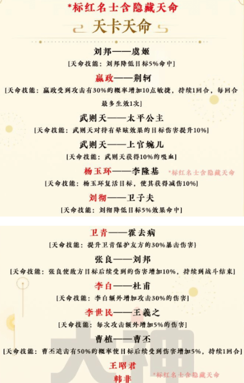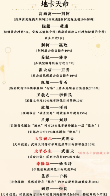 忘川风华录隐藏天命怎么解锁?忘川风华录游戏中角色之间的天命羁绊需要大家自己去找哦,那么下面小编就和大家分享一下全角色隐藏天命效果和解锁方法吧,详细内容如下。 忘川风华录天命羁绊大全天卡天命 刘邦——虞姬 天命技能:刘邦降低目标5%命中 赢政一一荆轲 天命技能:赢政受到攻击有30%的概率增加10点敏捷,持续1回合,每回合最多生效1次 武则天一一太平公主 天命技能:武则天对待有晕眩效果的目标伤害提升10% 武则天一一上官婉儿 天命技能:武则天获得10%的吸血 杨玉环——李隆基 天命技能:杨玉环复活目标,使其获得减伤10% 刘彻——卫子夫 天命技能:刘彻降低目标5%效果命中 卫青——霍去病 天命技能:提升卫青保护发方的30%暴击伤害 张良一一刘邦 天命技能:张良使敌方目标后续受到的伤害增加10%,持续到战斗结束 李白——杜甫 天命技能:李自额外增加攻击30%的伤害 李世民-—王 羲之 天命技能:每次攻击额外增加5%的伤害 曹植一一曹丕 天命技能:曹不追击有50%的概率使目标后续受到伤害增加5%,持续1回合 王昭君——韩非 地卡天命 高渐离-荆轲 高渐离觉醒提升荆轲10%攻击|荆轲觉醒无视10%防御 阮籍——嵇康 阮籍普攻增伤5%,觉醒不消耗音符嵇康睡眼敌人时增加阮籍的音符最多生效1次 荆轲——赢政 荆轲暴击伤害提升40% 苏轼——佛印 苏轼觉醒降低敌方攻击5% 霍去病一一卫青 霍去病觉醒暴击伤害提升40% 甄姬——曹丕 甄宓攻击10%概率叠加“行殇”I曹不觉醒暴击强度提升10% 王羲之——李世民 王羲之普攻50%概率降低日标防御10% 虞姬一一项羽 项羽带有“破釜沉舟”时效果命中提高15% 吕雉——刘邦 吕雉普攻附加“流血”时有25%几率额外附加一层“流血”1 刘邦攻击时15%概率附加“流血” 上官婉儿——武则天 天命技能:武则天对待有晕眩效果的目标伤害提升10% 太平公主一一武则天 天命技能:武则天获得10%的吸血 李隆基——杨玉环 李隆基攻击降低目标攻击5% 莫邪——干将 天命技能:莫邪对待有“烙印”的比表提升被动触发率10% 刘邦一—张良 天命技能:张良使敌方目标后续受到的伤害增加10%,持续到战斗结束 鱼玄机——范蠡 玄卡天命 李淳风一一袁天 罡 天命技能:李淳风攻击力上升7.5% 潘安———杨容姬 天命技能:杨容姬被击败时回复已方15%攻击的血量 潘安释放普攻有10%的概半偷取1真元给被治疗目标 石崇一一绿珠 天命技能:石崇生命值上升5%绿珠防御力上升10% 巴青——红拂女 ★隐藏天命: 李白—杨玉环 韩非—赢政 李世民—刘彻 卫青—刘彻 张良—刘邦 王昭君—毛延寿(玄级) 天命解锁方法 特定两个名士之间提升羁绊,并一起上场战斗就可以解锁隐藏天命了,例如政的隐藏天命是高渐离、杜甫的隐藏天命是李白等等,大家通过相进朝代和历史上的关系进行筛选即可。 两位名士在桃源居相遇,然后点击气泡可以进一步提升他们羁绊值了。如果大家嫌触发羁绊太慢的话,可以使用邀请函邀请想要提升的一对名士进行提升(你家园的舒适度越高羁绊值提升 |