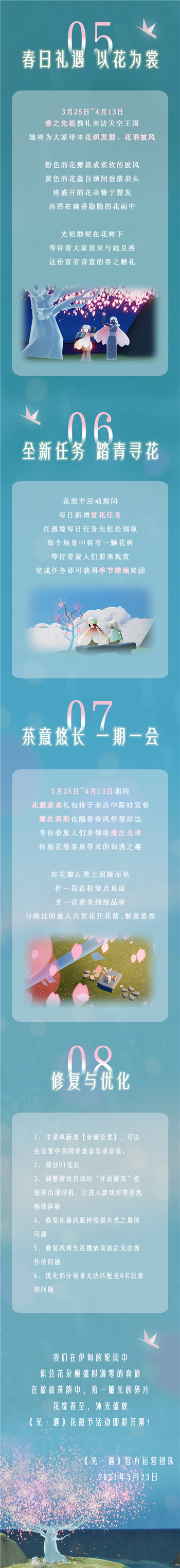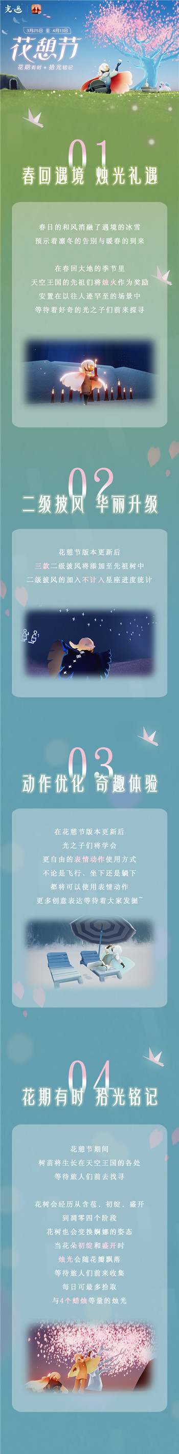 光遇花憩节什么时候上线?具体有哪些内容呢?光遇国服即将迎来“花憩节”,本次活动带来了许多新的物品和限定礼包。下面带来光遇花憩节活动更新内容总结,希望对各位小伙伴们有所帮助。 光遇花憩节内容介绍1、春回遇境 烛光礼遇 春日的和风消融了遇境的冰雪,预示着凛冬的告别与暖春的到来 在春回大地的季节里,天空王国的先祖们将烛火作为奖励,安置在以往人迹罕至的场景中,等待着好奇的光之子们前来探寻 2、二级披风 华丽升级 花憩节版本更新后,三款二级披风将添加至先祖树中,二级披风的加入不计入星座进度统计 3、动作优化 奇趣体验 在花憩节版本更新后,光之子们将学会更自由的表情动作使用方式 不论是飞行、坐下还是躺下,都将可以使用表情动作 更多创意表达等待着大家发掘~ 4、花憩有时 时光铭记 花憩节期间,树苗将生长在天空王国的各处,等待旅人们前去找寻 花树会经历从含苞,初绽,盛开到凋零四个阶段,花树也会变换婀娜的姿态 当花朵初绽和盛开时,烛光会随花瓣飘落,等待旅人们前来收集 每日可最多拾取与4个蜡烛等量的烛光 |