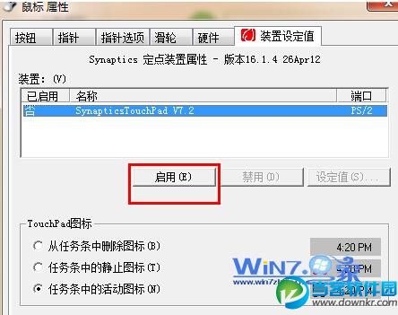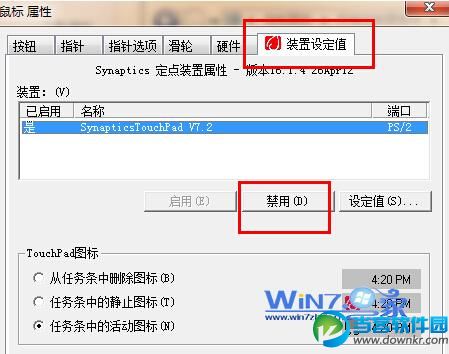 3、在打开的鼠标鼠标窗口中切换到“装置设定值”选项卡下,然后点击“禁用”按钮;