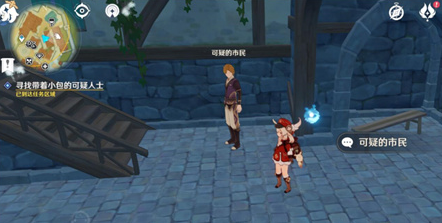 原神寻找带着小包的可疑人士位置在哪?原神游戏中寻找带着小包的可疑人士很多玩家不知道怎么寻找,那么下面小编就和大家分享一下带着小包的可疑人士位置吧。 原神寻找带着小包的可疑人士任务攻略任务简介: 主要就是打开元素视野,沿着元素视野的脚印往前走,找到可疑的人。 寻找带着小包的可疑人士是风花节逸闻任务节日里的不谐音的一部分,我们的旅行者被拜托在蒙德城里找到盗宝团的卧底 如图,任务期间在酒馆附近会新增一个叫“可疑的市民”的NPC,我们要找的就是他了 和他对话后选择对暗号触发剧情,然后骑士团就会来把他带走了 之后的任务步骤是去城外清剿盗宝团的同伙,都是普通小怪没什么好说的,打完回来交任务即可。 具体路线: 1、点击左上角的眼睛,打开元素视野,沿着下图的路线走。 2、到达下图的这个路灯位置会出现派蒙对话,她说脚印消失了,让我们往上爬。 3、接着我们就开始爬墙。 4、爬到上面,沿着下图的路线走。 5、最后上了楼梯之后,往左边走,可以看到绿色的家伙,完成任务。 |