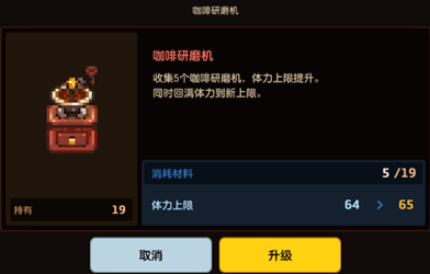 作用:咖啡研磨机,凑齐5个以后可以提升1点最大体力上限,同时将体力恢复至满值。(在提升上限前记得把体力用干净哦)