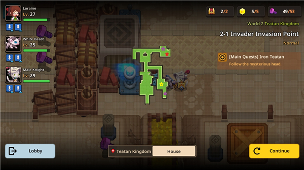 坎特伯雷公主与骑士唤醒冠军之剑的奇幻冒险世界2如何通关?世界任务的第二章玩法,玩家们不知道可以参照下面的攻略,都是小编为大家准备的,帮助玩家找到世界2任务的三星通关方法,快速的完成任务挑战, 坎特伯雷公主与骑士唤醒冠军之剑的奇幻冒险世界2攻略 图例:紫色星标——紫币;红色星标——宝箱/装备;黄色星标——星片;蓝色星标——支线地图/隐藏任务;黑色星标——黑色石板 2-1 开局往下走有2个紫螺丝,房屋里有隐藏通道,地图左边有木桩的地方需要通关剧情3-6解锁钩爪才能过去,最后和公主对话可以得到1个黄钻 第50个紫螺丝位置在公主下面的有个石块里,需要打碎石块。 开荒剩下3个螺丝,必须等3-5拿到钩爪后才能回来获取。 2-2 |