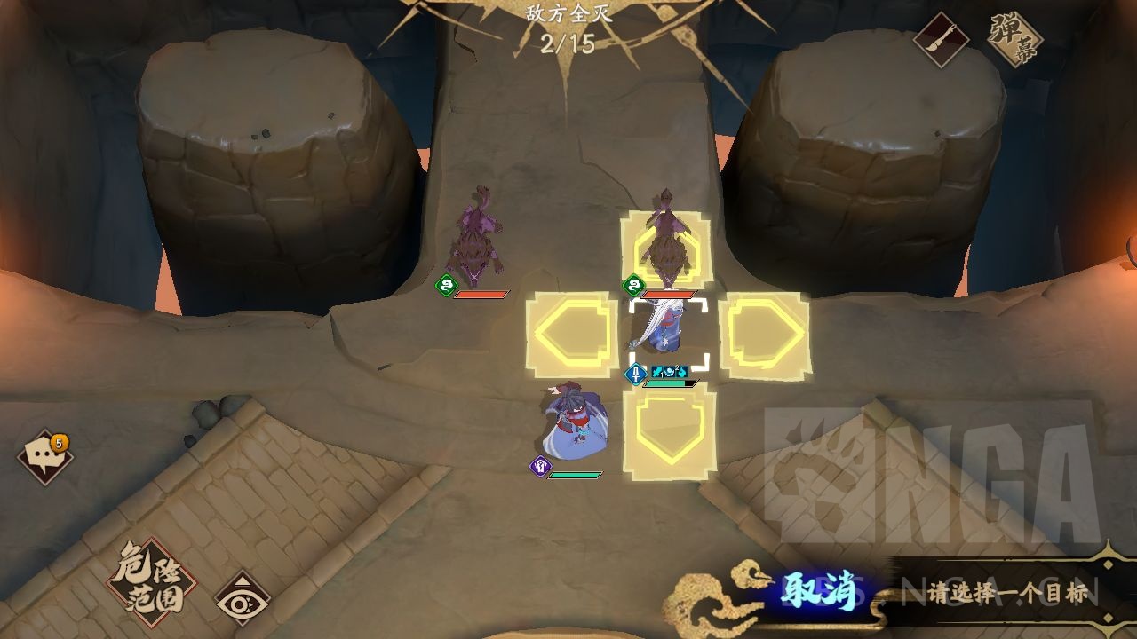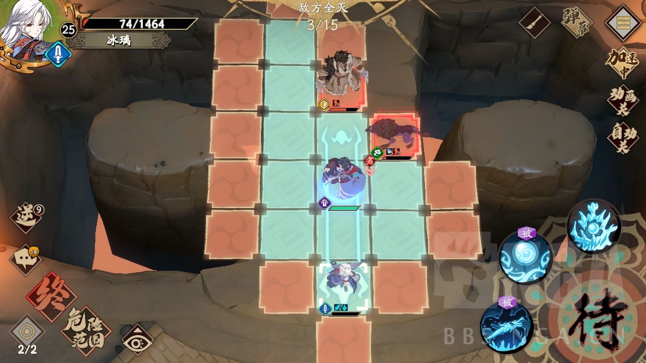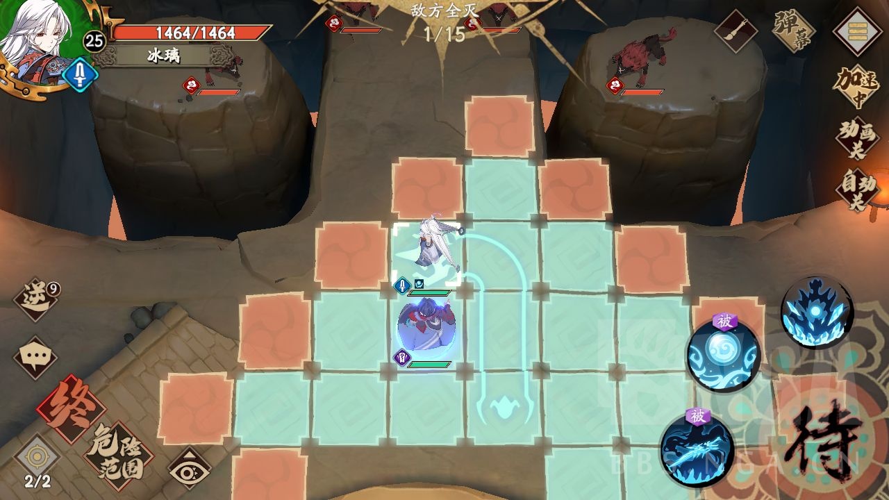第二步,冰璃向右移动一格,向上冰华飞刺,之后走到狼向上两格的中间位置,霍雍走到狼向上一个的中间位置,a左边的狼