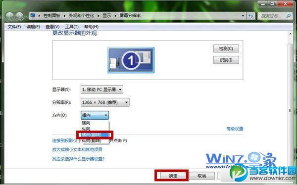 2、在打开的屏幕分辨率窗口中,可以看到下方的方向处,点击“方向后面的下拉按钮就可以选择你想要切换的方向了,比如“横向”,可以根据自己习惯进行设置,最后点击应用按钮之后再点击确定按钮就可以进行切换了哦。