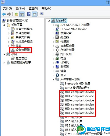 右键点击桌面上的计算机图标---管理---设备管理器---展开人体学输入设备---禁用所有HID-compliant device(如图),禁用之后触控屏幕马上就失效了。如果想使用触控屏,依次启用这些HID-compliant device即可使用。