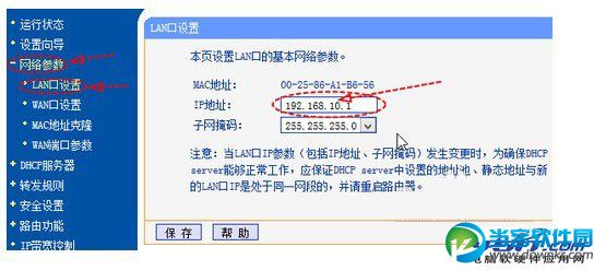 5.再次进入路由器管理界面,输入管理账号与密码后找到页面左侧的“网络设置”中的“LAN设置”,改变如图中“IP地址”的LAN设置为“192.168.10.1”完成设置以后一定要点“保存”并重启路由器。