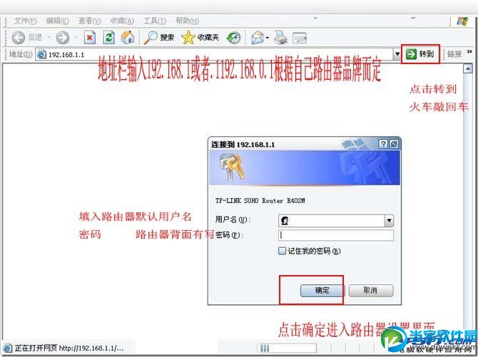 2、进入路由器设置界面:打开桌面上浏览器,在地址栏输入192.168.1.1或者192.168.0.1这个根据你路由器的品牌而定,翻过路由器背面就有写,输入完成后点击转到或者敲击ENTER回车。在弹出登陆框内输入路由器管理默认用户名密码一般都是admin,路由器背面也有写。如果没有标明的应该是让你自行设置一个密码设置完成后点击确定。