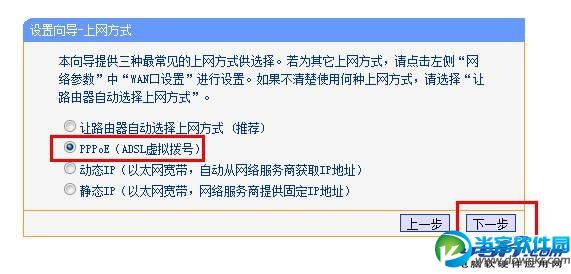 4.选择上网方式,一般都是选择PPPoE(ADSL虚拟拨号),点下一步。