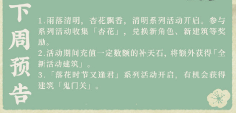 江南百景图建筑鬼门关怎么获得?江南百景图将于清明节期间上线一款新建筑鬼门关,这个名字直通阴阳的建筑诸位知府还不知道咋获得,以下是清明节限定建筑鬼门关的获取方法。 江南百景图清明节限定建筑鬼门关获取方法: 1.雨落清明,杏花飘香,清明系列活动开启。参与系列活动收集「杏花」,兑换新角色、新建筑等奖励。 2.活动期间充值一定数额的补天石,将额外获得「全新活动建筑」。 3.「落花时节又逢君」系列活动开启,有机会获得建筑「鬼门关」。 游戏介绍: 《江南百景图》是由椰岛游戏自主研发的古风模拟经营类手游。玩家需要扮演文征明,重绘明朝江南盛景,打造专属于你的江南百景图。在山水画卷中享受明朝水乡日常。玩家将梦回明朝江南地区,成为城市的设计师,描绘蓝图、兴造建筑、规划布局,经营赚钱。同时安排居民起居工作,写意世间百态,或带领大家奇遇探险。重绘明朝江南盛景,这里,就是你的世外桃源、绿野仙踪打造专属于玩家的江南百景图 |
