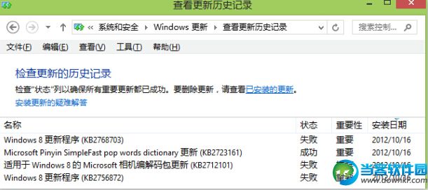 首先,进入系统以后,依次点击进入“控制面板”---“系统和安全”----“Windows 更新”---“查看更新历史记录”,在这里可以发现之前失败的更新。如图: