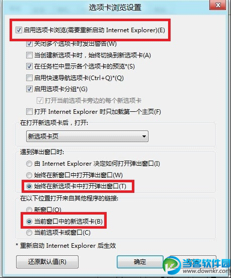 第4步:在打开的选项卡浏览设置界面中,勾选中“启用选项卡浏览”、“始终在新选项卡中打开弹出窗口”、“当前窗口中的新选项卡”这三项,并确定。