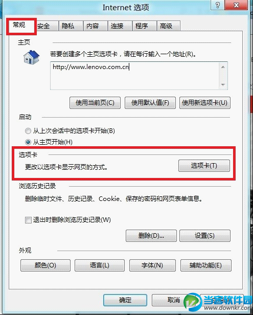 第3步:在打开的IE选项卡中的常规选项卡中找到并单击“选项卡”按扭。