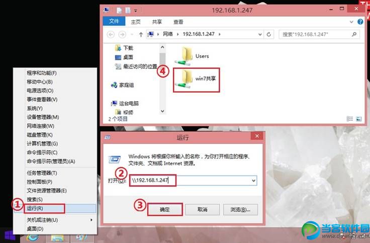 (1)Windows 8.1端:在左下角“开始”右键选择“运行”,输入”\\Windows 7端的IP地址”确认,可访问其共享文件;