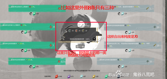 鬼谷八荒道界属性选什么好?道界属性词条一共有8个,合适的词条能让你更轻易的过关,道界词条只影响本次的通关速度,不会影响后续,所以本次小编来教教大家道界属性词条的选择攻略。 鬼谷八荒道界属性词条选择攻略: 化神升级悟道的道界一共6个。有击杀精英回血的词条建议带上。 在你能打通道界的情况下词条内的具体加成只影响你这把打的速度。不影响后续。 在你不打算这把融合道魂的情况下不需要打boss,离开不影响刷材料。 当你不打算这把融合道魂的时候只有打的吃力或者一些对自己极其不友好的词条才需要随机。 不需要看词条内的具体加成,只需要看词条后面的资质分类。 8条全部刷出来之后,每一条后面的资质共同组成中间合成框。 当你刷新材料过少不打算这把融合道魂那么这些毫无意义。 捡完材料离开下一把就行了。除非你是欧皇。 当你材料足够了,打算融合道魂了,分别刷新到你想要的资质类型。 分类只需要1-3类,最多不要超过3类。分类越多合成率和成品的纯度越低。 数值最大的那一类的值越大道魂纯度越高。 数值第2、第3大的那两类是允许互相融合的属性。 比如这里是风最大,掌剑其次。成品就是风属性道魂,可以和掌属性,剑属性道魂融合。 可以三个相同的道魂融合,所以你可以做三次每次都是8个剑呢。(不考虑后续属性) 然后点合成。就得到了道魂。 如果你前几把刷材料,第4个房间打完捡完材料离开就行了。不需要打boss。 不想打boss就不要进第4图的圈。 下面就是领域。 悟道的龙。 |
