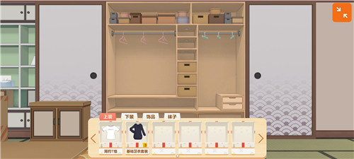 比如你想给胡桃换上简约T恤和牛仔裤,先将衣柜中的所有衣服都取出,然后点击上装【T恤】和下装【牛仔裤】。