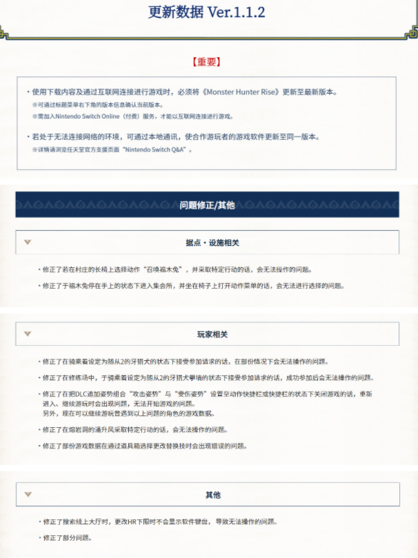怪物猎人崛起1.1.2更新了哪些内容?怪物猎人崛起游戏中最近有一些打开游戏的BUG,所以今天官方公布了1.1.2更新补丁,修复了这些bug,那么一起来看下详细介绍吧。 怪物猎人崛起1.1.2更新公告据点・设施相关: 修正了若在村庄的长椅上选择动作“召唤福木兔”,并采取特定行动的话,会无法操作的问题。 修正了于福木兔停在手上的状态下进入集会所,并坐在椅子上打开动作菜单的话,会无法进行选择的问题。 玩家相关: 修正了在骑乘着设定为随从2的牙猎犬的状态下接受参加请求的话,在部份情况下会无法操作的问题。 修正了在修练场中,于骑乘着设定为随从2的牙猎犬攀墙的状态下接受参加请求的话,成功参加后会无法操作的问题。 修正了在把DLC追加姿势组合“攻击姿势”与“受伤姿势”设置至动作快捷栏或快捷栏的状态下关闭游戏的话,重新进入、继续游玩时会出现问题,无法开始游戏的问题。 另外,现在可以继续游玩曾遇到以上问题的角色的游戏数据。 修正了在熔岩洞的涌升风采取特定行动的话,会无法操作的问题。 修正了部份游戏数据在通过道具箱选择更改替换技时会出现错误的问题。 其他: 修正了搜索线上大厅时,更改HR下限时不会显示软件键盘, 导致无法操作的问题。 修正了部分问题。 |