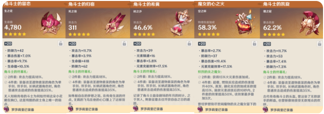原神罗莎莉亚怎么搭配圣遗物?原神游戏中罗莎莉亚正式上线了,那么下面小编就和大家一起来看看罗莎莉亚圣遗物的搭配方法吧,详细内容如下。 原神罗莎莉亚圣遗物搭配推荐物理流 由于没有培养高等级的龙脊长枪和流月针,所有在武器方面暂时使用的是90级精炼1阶段的护摩之杖,圣遗物选择了雷泽的四角斗士(无好属性骑士套)。 2200左右的攻击力,34的暴击率,204的暴击伤害。配队方面选择了钟离、皇女、重云,钟离起一个减抗的作用,皇女主要是配合打超导反应,重云暂时起到一个双冰共鸣加暴击的效果。 冰伤流 这种打法我同样选择了90级精炼1阶段的护摩之杖,圣遗物选择了4冰套。 1900左右的攻击力,31的暴击,210的暴击伤害。配队方面选择了钟离、行秋、重云,钟离起到减抗左右,行秋配合打冻结反应方面更好打出4冰套和双冰共鸣效果,重云主要起到凑双冰共鸣效果和冰附魔的作用。 推荐带冰风迷途的勇士 两件套效果 获得15%冰元素伤害加成 四件套效果 攻击处于冰元素影响状态下的敌人时,暴击率提高20%;若敌人处于冰冻状态下,暴击率额外提高20%。 获取方式 (4星)芬德尼尔之顶:祝圣秘境:告死之霜 Ⅰ 至 Ⅳ 概率掉落。 (5星)芬德尼尔之顶:祝圣秘境:告死之霜 Ⅲ 至 Ⅳ 概率掉落。 冰、暴击率 |