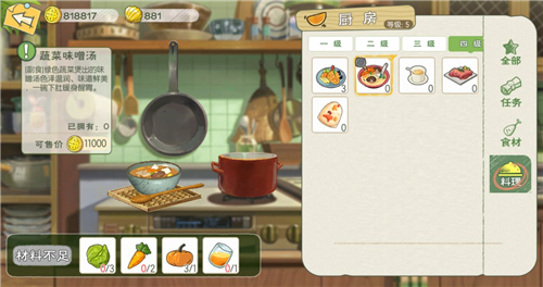 小森生活蔬菜味增汤解锁条件是什么?蔬菜味增汤是小森生活游戏中的一道高级食物,需要满足特定条件才能解锁蔬菜味增汤的食谱,就让小编来讲讲蔬菜味增汤食谱的解锁方法。 小森生活蔬菜味增汤食谱解锁方法介绍: 蔬菜味增汤要将厨房升到4级,然后完成料理学习任务,才能解锁。如果你厨房已经升到了4级,但是没有解锁食谱,就说明还未完成学习料理的任务,将其完成就有了。 制作方法:包菜*3+胡萝卜*2+南瓜*1+调味料*1 出售金币:5500 食用效果:恢复65点体力 蔬菜味增汤就是用三种蔬菜调味出来的汤,非常鲜香可口,暖身醒胃。 进入游戏以后,我们会在昔日好友的指引下来到属于我们自己的自宅。自宅是沿用了日语的写法,这是外婆留给我们的小屋,虽然看着有些破旧,但满满都是回忆。 我们可以通过累计资源来升级自宅,随着自宅的升级,就可以对“制作台”“锻造炉”“木工台”进行修缮,以此获得更多材料。 升级条件可以在院子中的“自宅信息板”查看,需要的材料也都一目了然,照着去收集即可。 |