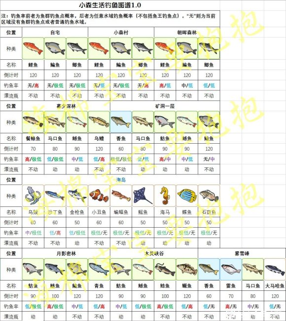 小森生活游戏中,钓鱼是非常麻烦的一件事情,各个水域鱼的产出情况,钓鱼饵的需求,钓鱼方法技巧,都不一样,就让小编来分享一套小森生活钓鱼图谱以及河鱼分布列表 钓鱼图谱以及河鱼分布列表 因为发现90%左右的鱼类可以靠倒计时选择性100%钓出,也就是可以根据倒计时来决定要不要退出钓鱼,如果不是自己想要的鱼点退出完全不费体力,需要注意的是鱼饵同样会消耗,普通无限鱼饵鱼类不受影响,因此此图则为普通无限鱼饵的鱼类。 图1:钓鱼图谱 也就是哪个小地图可以钓什么鱼的图,同时还有倒计时和钓鱼概率。其中前者表示鱼群点的钓鱼概率,无则当前区域没有鱼群,例如自宅和小森村。后者表示普通平静水面的钓鱼概率,无则表示当前区域没有平静钓鱼点或平静钓鱼点没有该鱼,例如雪山没有平静水面,海岛平静水面不出另外6种鱼。 图2:河鱼分布列表 顾名思义图也简单,也就是哪里可以钓到这种鱼,配合图1使用效果更佳。海岛鱼只能在海岛产出故未列入表 目前第一版就先这样。 之后因为游戏更新或者其他原因有什么变动的再改。 |