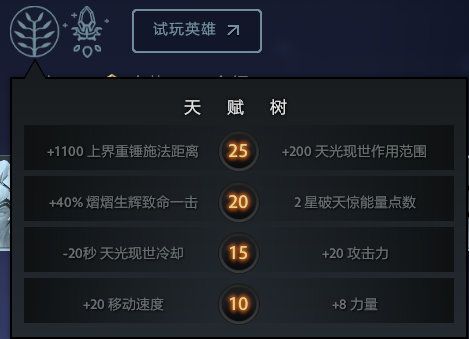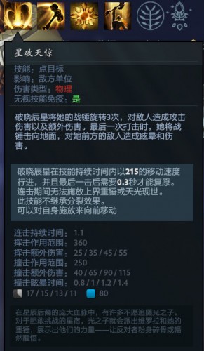 Dota2即将推出新的英雄,这位新英雄叫做破晓星辰,很多玩家看到新英雄第一时间自然就是想知道新英雄的技能是什么,以及天赋是什么,小编收集了有关内容和资讯,下面就来跟着蚕豆网小编一起来看一下详情吧。 一技能 星破天惊 破晓辰星将她的战锤旋转3次,对敌人造成攻击伤害以及额外伤害。最后一次打击时,她将战锤击向地面,对她前方的敌人造成眩晕和伤害。 二技能 上界重锤 破晓辰星向一个目标扔出她的武器,对沿途的敌人造成伤害。战锤会在目的地停留2.0秒,再飞回她的手中,期间留下一道烈火路径,减缓敌人的移动速度。破晓辰星可以随时召回战锤,将自身朝战锤牵引,使二者在中点相遇。 三技能 熠熠生辉 3次攻击后,破晓辰星提升了力量,她的下一次攻击会造成致命一击,并治疗她附近650范围内所有友方英雄,治疗量为攻击伤害的一定百分比。攻击小兵和野怪产生的治疗量有所减少,为35%。 四技能 天光现世 破晓辰星在地图上任意友方英雄350距离内的一个地点创造一个脉冲效果,每次脉冲都会对敌人造成伤害,并治疗友军。经过一段短暂时间后,她飞向目标地点,落地时造成额外伤害并眩晕敌人。开始持续施法后,破晓辰星无法中止此技能。 |