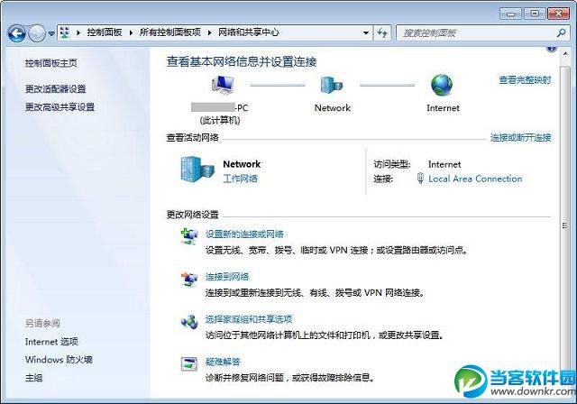A、在控制面板——网络和共享中心,设定好当前的网络类型即可(一般选择工作网络),IP地址如非特殊需要就不用设置(公司办公的一般为了考虑共享需要可以考虑分配IP地址),路由器会自动为计算机分配运行时IP地址(一般都是内网地址)。如下图1(中间部分):