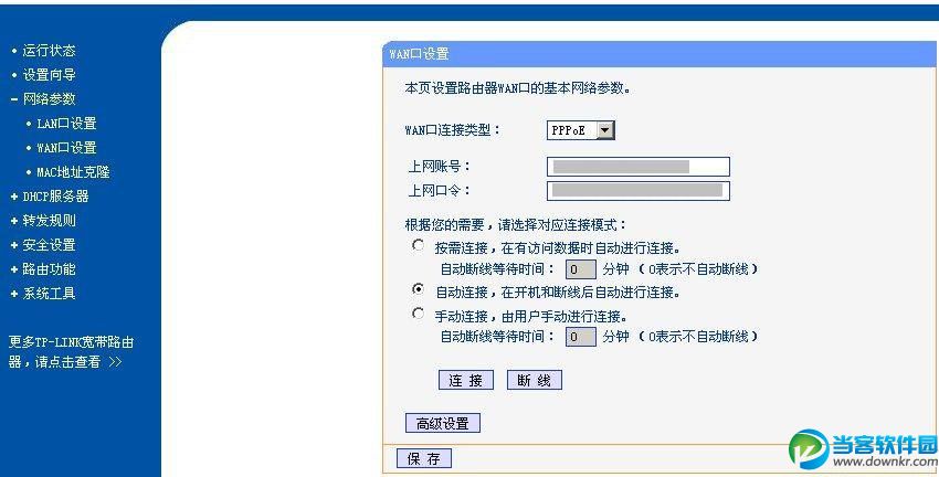 上图为TP-LINK R402的管理界面截图,大家可以在网络参数——WAN口设置里面,输入上网账号和口令密码(电信或网通为您安装时候留下给您的),底下选择自动连接,这样只要每次路由器和ADSLMODEM一上电就会自动控制ADSL登录网络,无需手动再次干预。其它路由器设置类似。