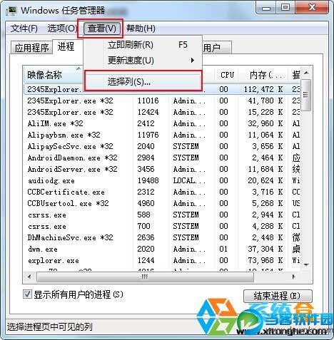 3、点击任务管理器菜单上的“查看按钮”,并选点击“选择列”;