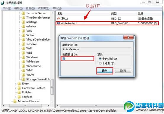 3. 在右侧窗口中找到“ WriteProtect ”表,双击打开WriteProtect将数值数据改为“0”结束操作。如下图所示