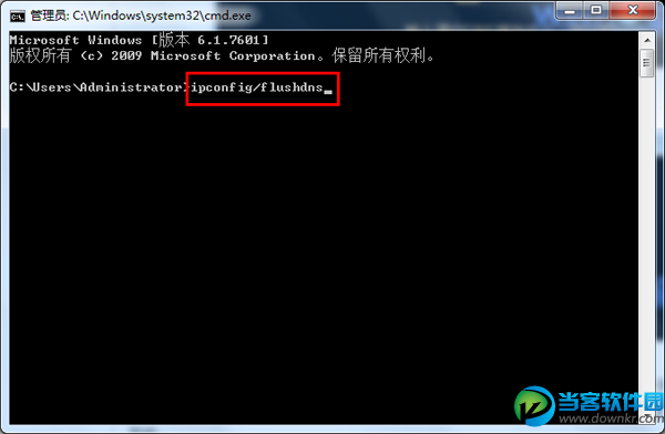 2.在打开的命令提示符中输入“ipconfig/flushdns”,回车确定