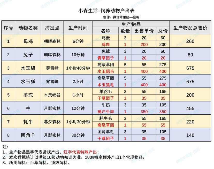 这个是可以饲养的动物产出表,因为特殊物品是有概率出的,所以想要100%产出就需要百草饲料或者顶级饲料。